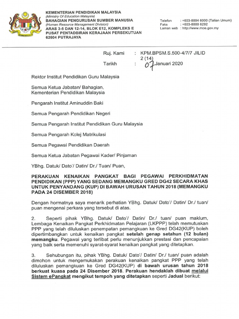 Urusan kenaikan pangkat bagi pegawai perkhidmatan pendidikan (ppp) gred dg32 hingga gred dg54 secara tbkk di kementerian pendidikan malaysia bagi januari hingga jun tahun 2018. 7.1 pegawai yang dilantik secara terus ke gred kenaikan pangkat atau ke gred lantikan yang setara dengan gred kenaikan pangkat dalam skim perkhidmatan bersepadu seperti pembantu pegawai latihan. D) berita kenaikan pangkat secara time based berasakan kecemerlangan (tbk) kumpulan pelaksana bil. Faedah persaraan pada tahun 2018 adalah sebanyak rm 24 billion. Ahli lembaga kenaikan pangkat atau lembaga rayuan kenaikan pangkat mengikut peraturan yang berkuat kuasa bagi perkhidmatan yang berkenaan.