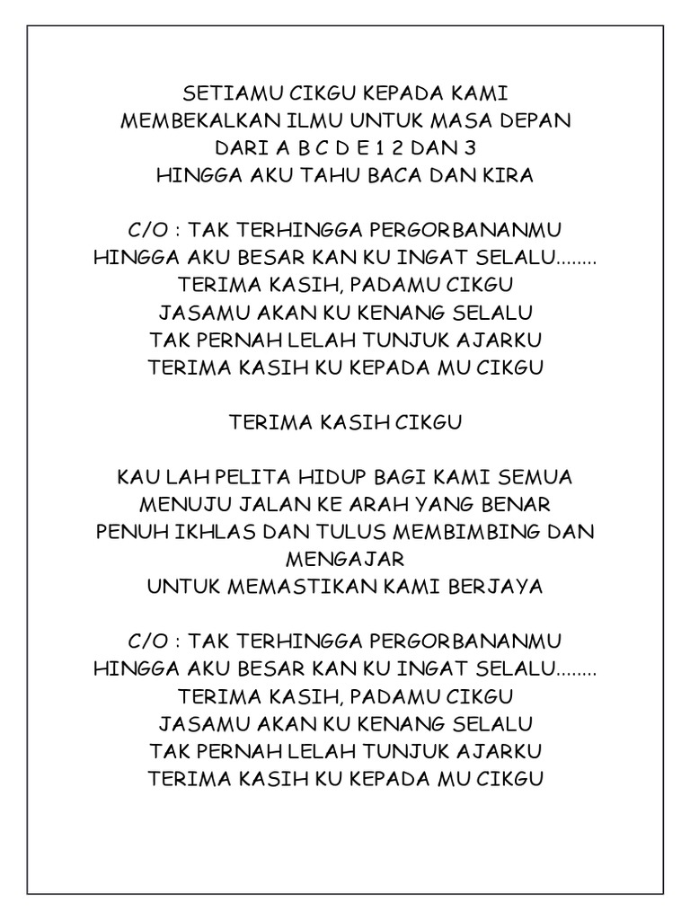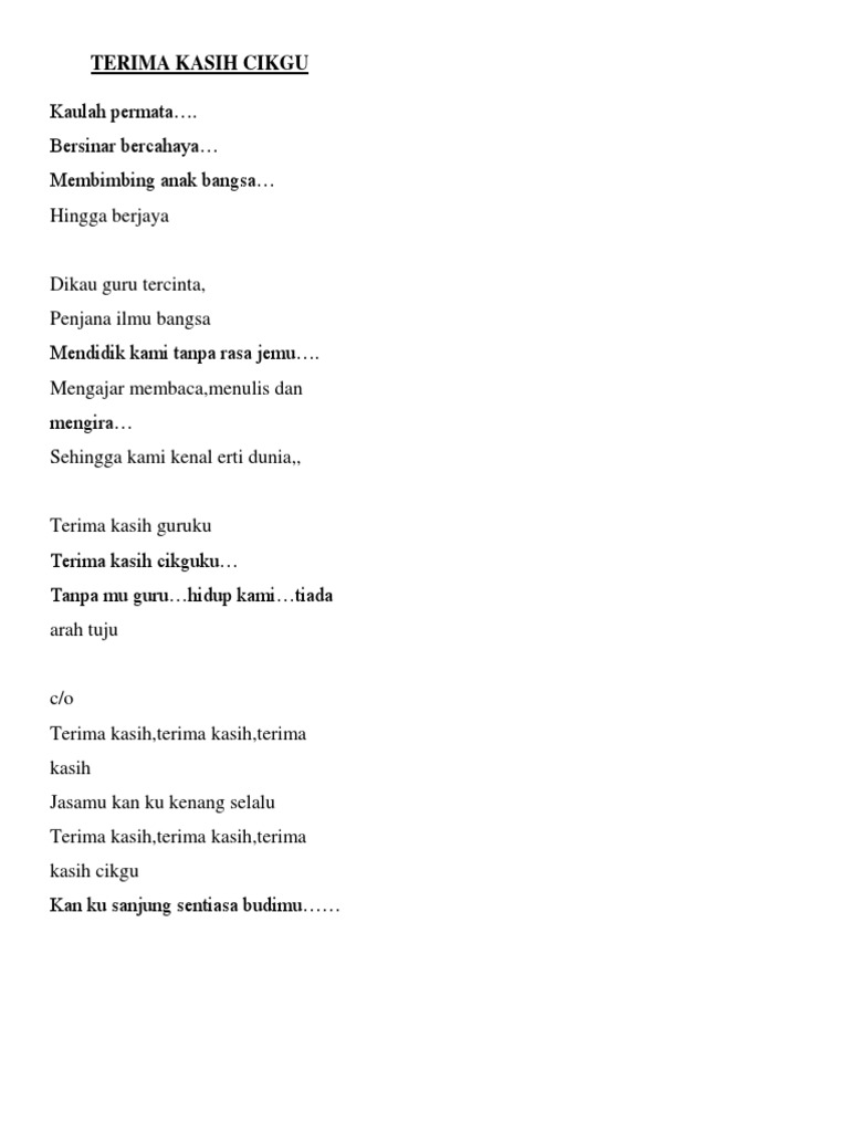Lirik Lagu Hari Guru from img.dokumen.tips List download lagu mp3 terima kasih cikgu (5:57 min), last update apr 2021. Terima kasih cikgu ~ dendang si alai.wmv mp3 duration 4:25 size 10.11 mb / aza lieza 11. Lagu untuk cikgu bimbingan yayasan sp setia. Detail terima kasih cikgu u mp3 dapat kamu nikmati dengan cara klik tombol download mp3 di bawah, dan untuk link download lagu terima kasih cikgu u ada di halaman selanjutnya. Chords ratings, diagrams and lyrics. Liriktulus setiamu cikgu telah mengajar kamimembekalkan ilmu untuk masa depandari abcde 12 dan 3 hingga aku tahu baca dan kiratak terhingga. Untuk melihat detail lagu terima kasih cikgu klik salah satu judul yang cocok, kemudian untuk link download terima kasih cikgu ada di halaman berikutnya. G d em bm tulus setiamu cikgu telah mengajar kami c g am d membekalkan ilmu untuk masa depan g d em bm c g am d dari abcde 12 dan 3 g d em bm terima kasih pada mu cikgu c g am d jasa mu akan ku kenang selalu g d em bm tak pernah lelah tunjuk ajarku c g am d g terima.