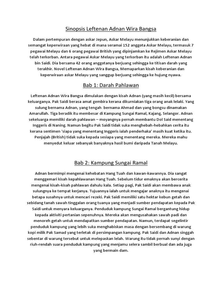 Learn vocabulary, terms and more with flashcards, games and other study tools. There might be some minor mistakes so please point out those mistakes. Sinopsis novel leftenan adnan wira bangsa. Leftenan adnan merupakan sebuah filem patriotik malaysia 2000 yang diarahkan oleh aziz m. Osman dan dibintangi oleh hairie othman, umie aida, rambo chin, faizal hussein, rusdi ramli, shaharuddin thamby dan wahid senario.